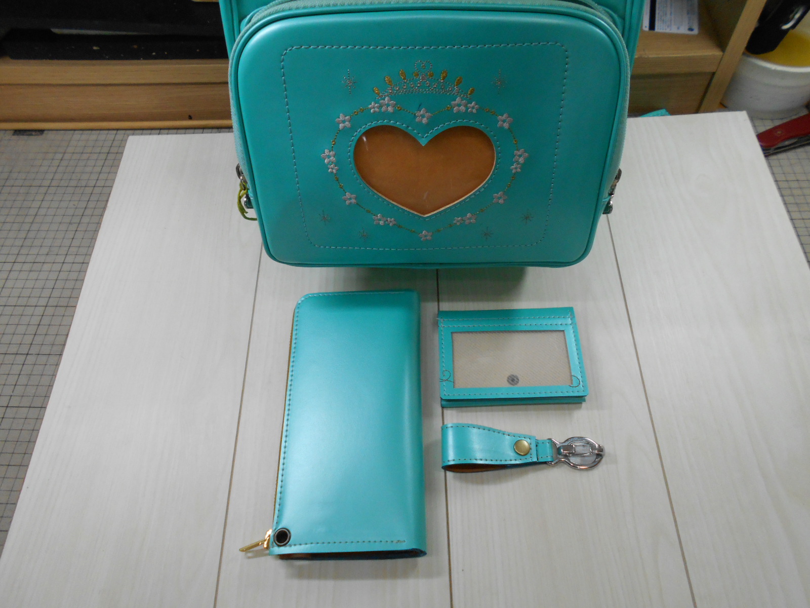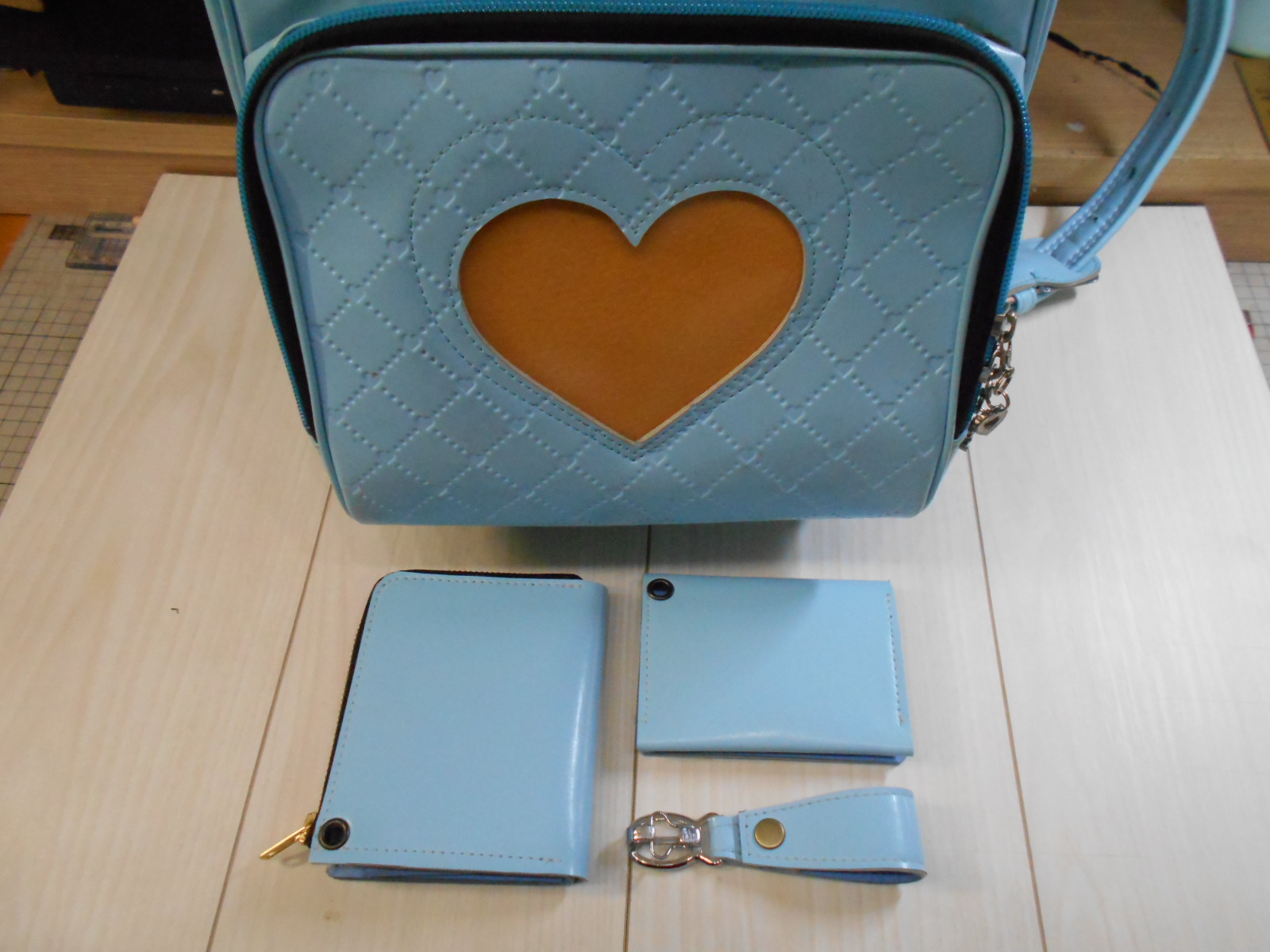 ライトブルーのランドセルからファスナー長財布3点セット